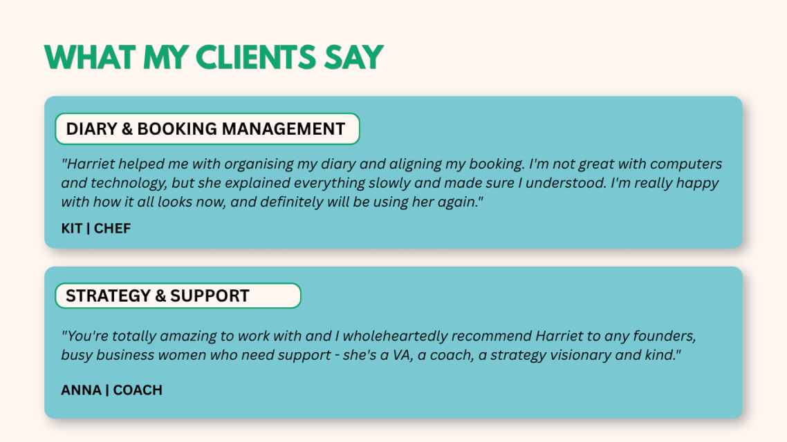 I'm Harriet. I work alongside small business owners as a business support and strategy partner — helping you figure out what to focus on, building the systems to support it, and making sure it actually gets done.